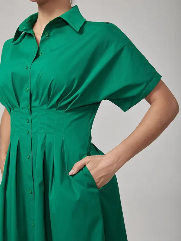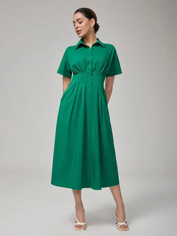 Women’s Maxi Dress Vintage Green Cotton Pleated Waist Shirt Collar Casual Elegant Spring Summer Fall