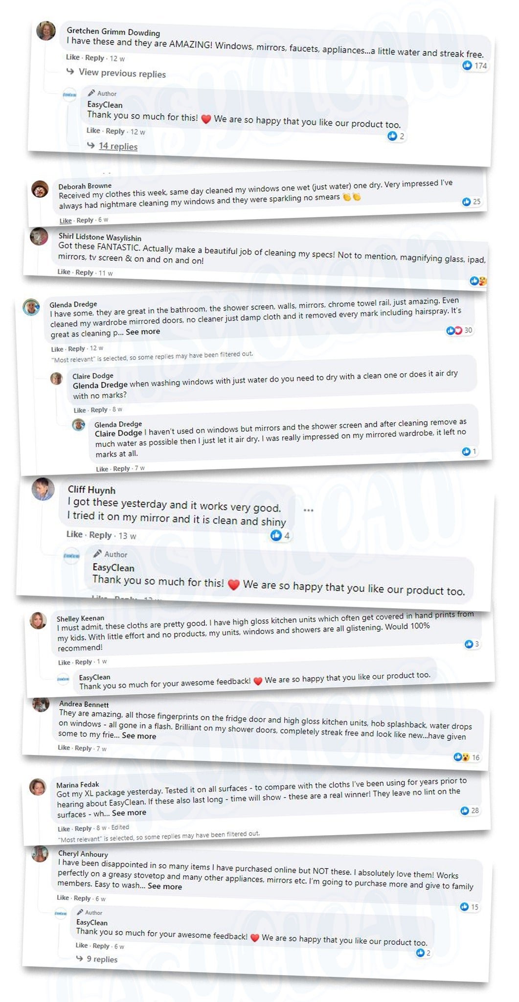 “If you are looking for a cloth that works great on any surface then you need to try these. I was skeptical at first about buying online but I am so glad I took the chance! 10/10 this type of cloth is highly recommended, have already told my friends and family about them.”