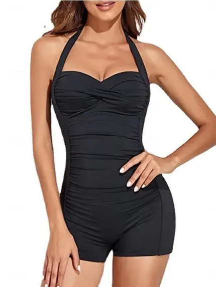 Women’s One Piece Swimsuit Slimming Ruched swimming suit with shorts Monokini Halter Tummy Control High Waist Slim Backless Vacation Beach Wear Solid Color Halter Neck Sleeveless Bathing Suits